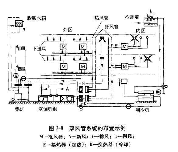圖3-8表示了一個完整的(包括冷熱源)的雙風管空調系統的布置情況,通常因混合箱價格較高,所以有時以幾個風口或一個區采用一個混合箱,混合箱后采用普通的低速風管和送風口。