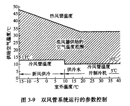 當設計雙風管空調系統時,通常可用下列數據:冷風溫度全年為12 - 15℃;夏季熱風溫度僅比室溫高3℃;冬季熱風溫度為35—45℃,過渡季熱風溫度為25_35℃。圖3.9為雙風管系統全年運行時冷熱風等溫度參數控制的一例。設計風管時,冷風量按總風量的100%計算,熱風量按總風量的50%一70%考慮。故一般用高速系統送風以減小風管斷面尺寸。此外,為了減少雙風管系統的運轉費用,也已開發了雙風管可變風量系統,這不僅要求混合箱具備變風量功能,而且送風機的風量亦應予以控制,初投資將高于定風量系統。