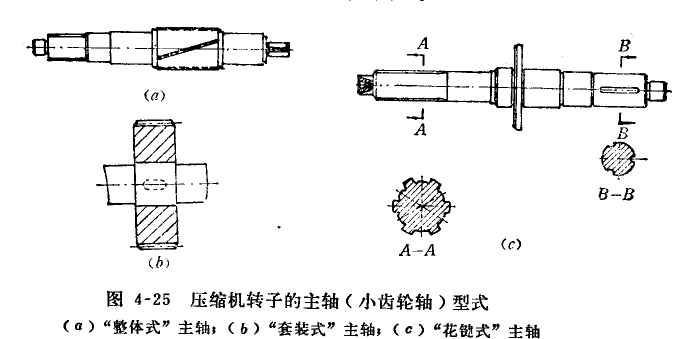 主軸在空調用離心式制冷壓縮機上常做成“整體式”(圖4-25a),即主軸與小齒輪(即高速齒輪)整體加工而成,大多用于單級和雙級懸臂式壓縮機轉子的主軸。其材質一般采用優質合金鋼(如35CrMoVA),并經調質熱處理。