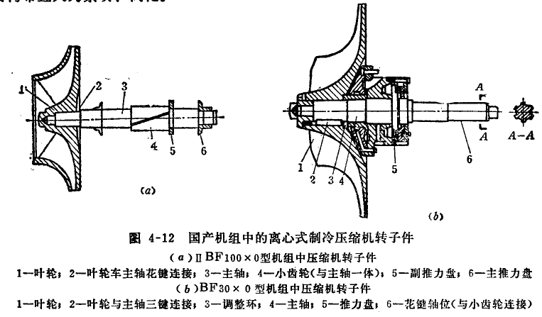 在某些壓縮機轉子結構中(圖4-12a),采用主、副推力盤(或稱左、右推力盤),其作用、材質、表面硬化處理與前者一致。