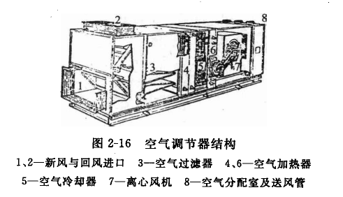 空氣調(diào)節(jié)器又稱(chēng)空調(diào)器,其作用是完成對(duì)空氣的處理,以滿(mǎn)足空調(diào)所要求的空氣送風(fēng)溫度、濕度、速度、清潔度。空調(diào)器主要由空氣混合室、空氣過(guò)濾器、加熱器、加濕器、冷卻器、擋水板、空氣分配室、消音室和風(fēng)機(jī)等組成,如圖2-16所示。