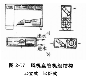 風(fēng)機(jī)盤(pán)管由盤(pán)管、風(fēng)機(jī)(前向多翼離心風(fēng)機(jī)或貫濾風(fēng)機(jī))、電動(dòng)機(jī)、空氣過(guò)濾器、凝水盤(pán)及箱體組成,還配有室溫自動(dòng)調(diào)節(jié)裝置,機(jī)組有立式、臥式、立柱式和頂棚式四種。它又有明裝與暗裝,與風(fēng)機(jī)盤(pán)管相接的有冷、熱水管路和凝水管路,其結(jié)構(gòu)如圖2-17所示。