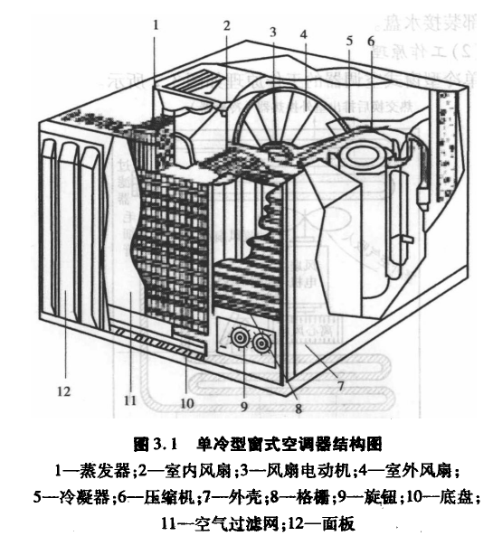 單冷型窗式空調器的結構如圖3.1所示。它由制冷系統、電氣控制系統、空氣循環系統和箱體支撐系統等四部分組成。