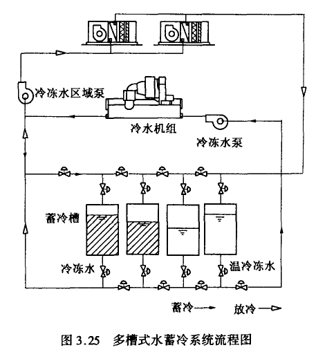 圖3.25所示為多槽式水蓄冷系統流程圖。在系統中設置了多個蓄冷槽,將冷水和熱水分別儲存在不同的蓄冷槽中,并保證蓄冷和放冷開始時有一個槽是空的。利用設置的空槽實現冷熱水分離。從而保證送至負荷的冷水溫度維持不變。在蓄冷過程中,蓄冷槽自左至右逐個充滿,進行蓄冷的蓄冷槽右側槽中的熱水由下部閥門控制將熱水抽出。送至冷水機組冷卻后進入蓄冷槽。當蓄冷槽充滿時,緊靠右邊槽中的熱水也剛好抽空。類似地,當蓄冷過程結束時,右邊第一槽是空的。在放冷循環中,方向相反。運行時,多槽系統中個別蓄水槽可以從系統中分離出來進行檢修維護。多槽蓄冷系統要求使用的閥門較多,故其系統的管路和控制較復雜,初投資和運行維護費用較高。