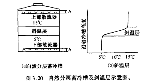 圖3.20所示為蓄冷槽和斜溫層內溫度變化簡圖。在蓄冷槽中設置了上下兩個均勻分配水流散流器。為了實現自然分層的目的,要求在蓄冷和放冷過程中,空調回流溫水始終從上部散流器流人或流出,而冷水是從下部散流器流人或流出,應盡可能形成分層水的上下平移運動。在自然分層的水蓄冷槽中,斜溫層是一個影響冷熱分層和蓄冷槽蓄冷效果的重要因素。它是由于冷熱水間自然的導熱作用而形成的一個冷熱溫度過濾層。它會由于通過該水層的導熱、水與蓄冷槽壁面和沿槽壁的導熱,并隨儲存時間的延長而增厚,從而減少實際可用蓄冷水的體積,減少可用蓄冷量。蓄冷槽儲存期內斜溫層的變化是衡量蓄冷槽蓄冷效果的主要指標。一般希望斜溫層厚度為0.3m-1.0m。