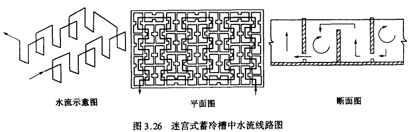 圖3.26所示為迷宮式蓄冷槽中水流線路圖。它采用隔板將大蓄水槽分成很多個單元格,水流按照設計的路線流過每個單元格。迷宮法能較好地防止冷溫水混合,但在蓄冷和放冷過程中,水交替地從頂部和底部進口進入單元格,每兩個相鄰的單元格中就有一個是熱水從底部進口進入或冷水從頂部進口進入,這樣易因浮力造成混合。另外,若水流速過高,則在蓄冷槽內會產生旋渦,導致水流擾動及冷熱水的混合;若水流速過低,則會使進出口端發生短路,在單元格中形成死區,使其于空間不能充分利用,降低蓄冷系統的容量。