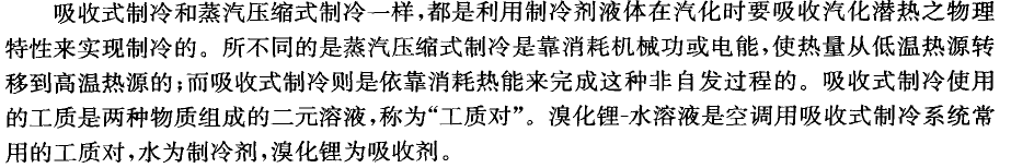 吸收式制冷和蒸汽壓縮式制冷一樣,都是利用制冷劑液體在汽化時要吸收汽化潛熱之物理特性來實現制冷的。所不同的是蒸汽壓縮式制冷是靠消耗機械功或電能,使熱量從低溫熱源轉移到高溫熱源的;而吸收式制冷則是依靠消耗熱能來完成這種非自發過程的。吸收式制冷使用的工質是兩種物質組成的二元溶液,稱為“工質對”。溴化鋰—水溶液是空調用吸收式制冷系統常用的工質對,水為制冷劑,溴化鋰為吸收劑。