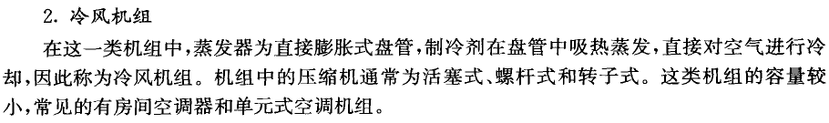 在這一類機組中,蒸發器為直接膨脹式盤管,制冷劑在盤管中吸熱蒸發,直接對空氣進行冷卻,因此稱為冷風機組。機組中的壓縮機通常為活塞式、螺桿式和轉子式。這類機組的容量較小,常見的有房間空調器和單元式空調機組。
