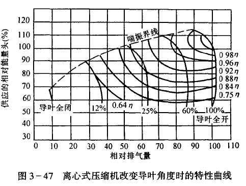 葉輪所產生的能量頭就有變化,從而改變了壓縮機的特性曲線。圖3-47表示了離心式壓縮機不同導葉開度時的特性曲線。從圖上看到,要保持相同的能量頭,制冷量將隨著導葉的關閉而下降。這種調節方法在氟利昂離心式壓縮機中普遍得到采用。其合理的詞節范圍比較寬(30%~100%),容易實現自動調節,經濟性好。