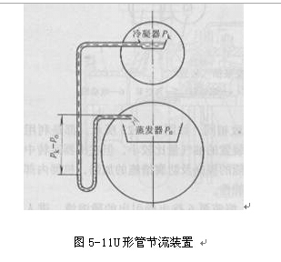 U形管節(jié)流裝置結(jié)構(gòu)簡單、工作可靠、流量調(diào)節(jié)幅度寬,是溴化鋰吸收式制冷機(jī)中應(yīng)用最早、最廣的節(jié)流裝置。我國生產(chǎn)的單效機(jī)或兩效機(jī)都采用這種節(jié)流方式。由圖5-11可知,U形管的高度是保證節(jié)流的關(guān)鍵,其值與冷凝器、蒸發(fā)器間的壓力差(pk-pO)有關(guān)。一般情況下,冷凝器與蒸發(fā)器的壓差大約為9.8kPa,因此,U形管的高度略高于1m即可。其管徑則是根據(jù)機(jī)組的制冷量而定。這種節(jié)流裝置的缺點是外形尺寸較大,結(jié)構(gòu)不夠緊湊,對于壓差較大的兩側(cè),如高壓發(fā)生器與冷凝器之間不宜采用。