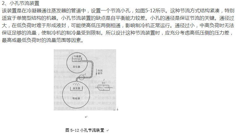節(jié)流裝置是一個重要部件。它有多種型式。可以是針狀節(jié)流閥,浮球閥、U形管或小孔節(jié)流元件。溴化鋰吸收式制冷機(jī)中最常用的是U形管和小孔節(jié)流元件。