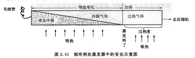 蒸發(fā)器是制冷系統(tǒng)的主要換熱部件之一.經(jīng)節(jié)流降壓后的低溫低壓制冷劑液體在其內(nèi)蒸發(fā)(沸騰)變?yōu)橹评鋭┱魵狻T谡舭l(fā)器內(nèi)吸收被冷卻物體的熱量而蒸發(fā)成制冷劑蒸氣,從而使物體溫度下降,達(dá)到制冷的目的。在電冰箱和空調(diào)器中,制冷劑通過(guò)蒸發(fā)器冷卻周?chē)目諝猓_(dá)到對(duì)空氣降溫、除濕的作用。蒸發(fā)器內(nèi)制冷劑的蒸發(fā)溫度越低,被冷卻物體的溫度也越低。在電冰箱中一般制冷劑的蒸發(fā)溫度調(diào)整在-20—-26℃,在空調(diào)器中調(diào)整在5~8℃,制冷劑蒸發(fā)過(guò)程中會(huì)呈現(xiàn)復(fù)雜的兩相流狀態(tài),圖3.41所示僅為制冷劑在蒸發(fā)器中的變化示意圖.