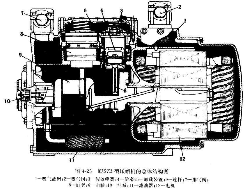 半封閉式壓縮機同開啟式壓縮機相比較,具有結構緊湊、體積小、重量輕的特點。以如圖4-25所示的8FS7B型壓縮機為例,半封閉式與開啟式在結構上最明顯的區別在于電動機殼體和壓縮機機體是鑄在一起的,內腔相通,不需要軸封,避免軸封漏泄的弊病,并且還可利用吸入的低壓低溫制冷劑蒸氣來冷卻電機繞組,改善電動機的冷卻條件,減少電動機的電耗,提高電動機的出力。而且壓縮機與電動機之間取消了聯軸器,縮短了機組的軸向尺寸。所以,目前50mm和70mm缸徑的系列壓縮機多數都制成半封閉式。70mm缸徑的系列產品中,四缸以上的均設有能量調節裝性。在半封閉式壓縮機中,潤滑油應考慮到不論壓縮機正轉或反轉都能正常供油,所以多數采用月牙型內嚙合齒輪油泵。