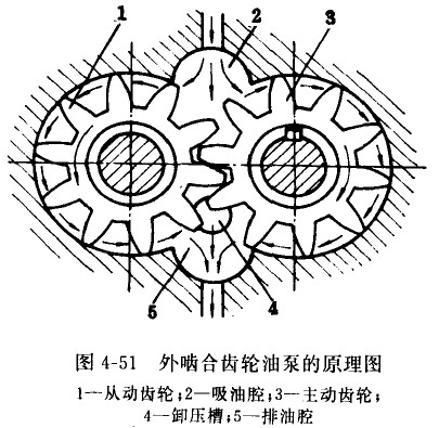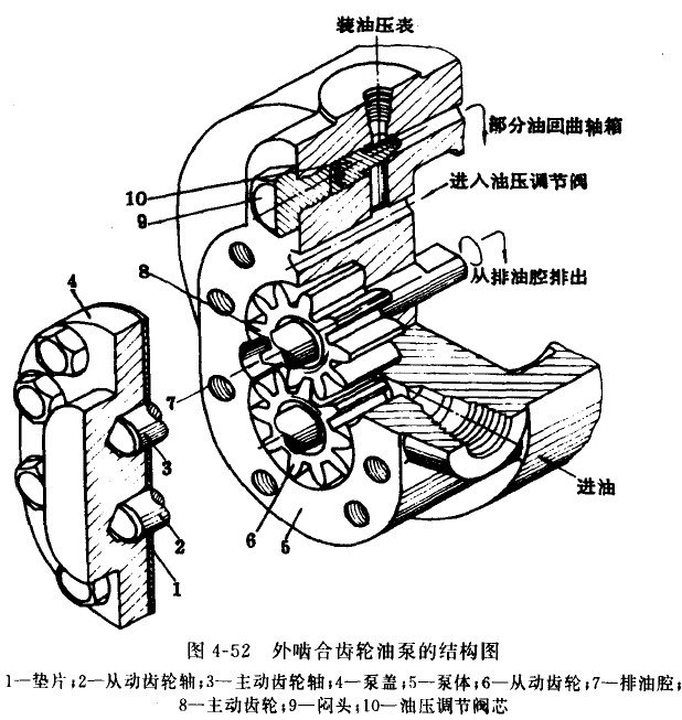 圖4-51是外嚙合齒輪油泵的工作原理圖。2FIO,4FIO機均用此種油泵。油泵的殼體內有兩個互相嚙合的同直徑外齒輪,齒輪與殼體內腔之間具有很小的徑向間隙和端面間隙,因此,齒間凹谷與泵體內壁形成許多貯油空間。當曲軸帶動主動齒輪旋轉時,這些空間隨之移動,于是,充滿空間的潤滑油就從吸油腔二邊被送到排油腔一邊,并源源不斷地被向外排出。中間相互嚙合的齒面實際上就是吸油腔與排油腔之間的密封面。當齒間凹谷與對應齒輪進入完全嚙合,形成一密封空間時,為避免其中留存的潤滑油受到強烈地壓擠,在殼體端面上開有卸壓槽,以便讓留存的潤滑油由此泄出。圖4-52是這種油泵的結構圖,它的供油壓力可以用轉動油壓調節閥芯,改變旁通油道的通道截面來予以調整。順時針向里旋轉為油壓升高,反之,則油壓降低。