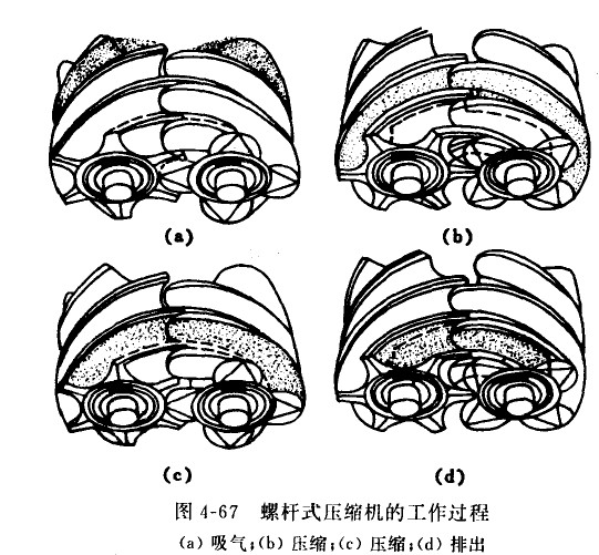 陽轉子有四個齒,陰轉子有六條齒溝。當陽轉子及陰轉子回轉時,其嚙合部分在吸入口側逐轉脫開,齒與齒溝形成的基元容積逐步變大。由于該基元容積經吸入口與吸氣管相通,所以隨著基元容積的變大進行壓縮機的吸氣過程。當這個基元容積增大到最大時(即陽轉子的齒和陰轉子的齒溝完全脫開),轉子雖繼續回轉,基元容積也不變化。當基元容積繞過吸入口后,被端座封閉,與吸氣管隔開,成為一封閉容積,從而完成了吸氣過程。