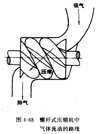 制冷劑蒸氣在螺桿式壓縮機中吸入和排出是在轉子的兩端進行的。一般吸氣過程是在轉子的上半部分進行,壓縮和排氣是在轉子的下半部分進行,制冷劑蒸氣在壓縮機中內流動路線如圖4-68所示。