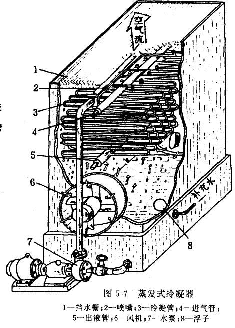蒸發(fā)式冷凝器的結(jié)構(gòu)簡圖如圖5-7所示。它主要利用水蒸發(fā)時吸收熱量而使管內(nèi)制冷劑蒸氣冷凝。制冷劑蒸氣由上部進入蛇形盤管,冷凝后的液體從盤管的下部流出。冷卻水貯于箱底部水池中,用浮球閥保持一定的水位。水池中的冷卻水用水泵送到噴水管,經(jīng)噴嘴噴淋在傳熱管的外表面上,形成一層水膜。水膜中部分水吸熱后蒸發(fā)為水蒸氣被空氣帶走,未蒸發(fā)的水仍滴回水池內(nèi)。在箱體上方裝有擋水柵,用來阻擋空氣中夾帶的水滴,以減少水的飛散損失。水池中的水由于水的蒸發(fā)而不斷減少,同時水中的含濃鹽度也不斷增加,故需要經(jīng)常補充經(jīng)過軟化處理的冷卻水。