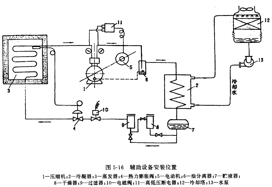 在壓縮式制冷系統(tǒng)中,除了必須的壓縮機(jī)、冷凝器、蒸發(fā)器和節(jié)流閥以外,還有許多改善制冷系數(shù)和保證運轉(zhuǎn)安全不可缺少的輔助設(shè)備。屬于這類設(shè)備的主要有:油分離器、貯液器、過濾器、干燥器和冷卻塔。這些輔助設(shè)備在制冷系統(tǒng)中的相對位置如圖5-16所示。下面把這些輔助設(shè)備的功用、構(gòu)造和工作原理作些簡單的介紹。