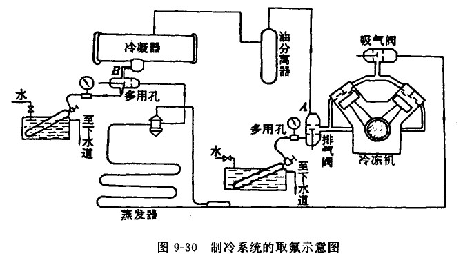 (5)隨著系統內氟利昂的減少,高壓壓力就會降低,因此在B處取氟將會十分困難,可以換在A處取氟。利用A處取氟,應調節冷凍機吸入截止閥之大小,以排氣壓力不超過0.98MPa為宜。