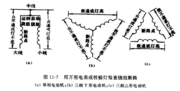 檢查單相或三相電動(dòng)機(jī)斷路時(shí),可用兆歐表或用萬用電表(放在低電阻檔)、校驗(yàn)燈來校驗(yàn)(見圖11-7)。對于星形接法的電動(dòng)機(jī),檢查時(shí)需每相分別測試I對于三角形接法的電動(dòng)機(jī),檢查時(shí)必須把三相繞組的接線頭拆開后,再每相分別測試。測試時(shí),哪一相表不通或燈不亮即為這相斷路。泵殼內(nèi)斷路需剖開泵殼檢修。