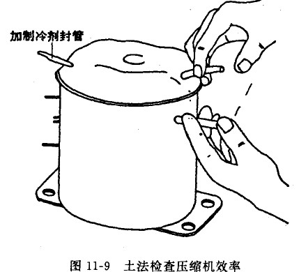若加制冷劑無效,可將制冷劑抽出(另用壓縮機(jī)抽),割斷泵殼上的吸、排氣管,然后接電源運(yùn)轉(zhuǎn),用手指按住排氣管讓壓縮機(jī)壓氣,當(dāng)壓氣至手指按不住氣壓,再用手指按住吸氣管感覺有吸力,一般認(rèn)為壓縮機(jī)是可以用的,如圖11-9所示。
