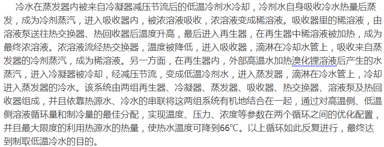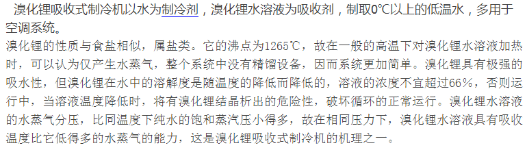 溴化鋰吸收式制冷機組是以水為制冷劑,溴化鋰溶液為吸收劑,采用低壓蒸氣為能源的設(shè)備。它可以制取0℃以上的冷凍水,適用于建筑物大面積的中央空調(diào)和其他需要冷卻降溫的場所。