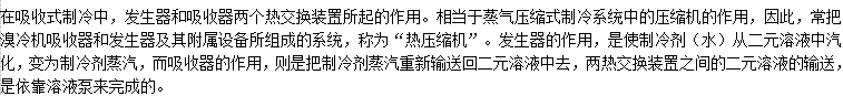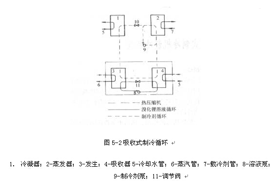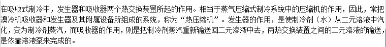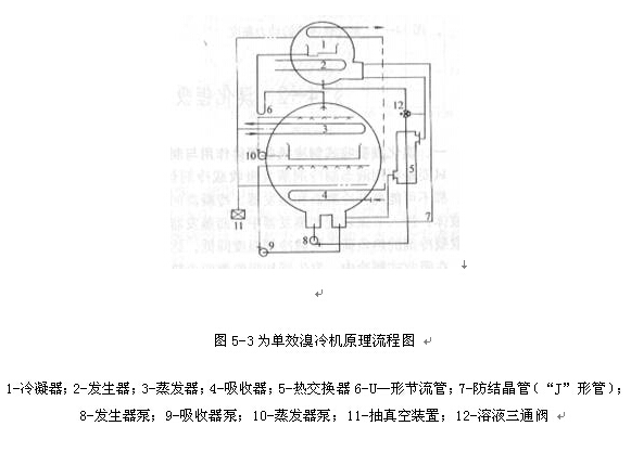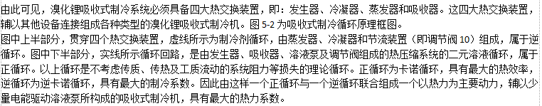 溴化鋰吸收式制冷機工作原理:溴化鋰吸收式制冷機是以溴化鋰溶液為吸收劑,以水為制冷劑,利用水在高真空下蒸發吸熱達到制冷的目的。為使制冷過程能連續不斷地進行下去,蒸發后的冷劑水蒸氣被溴化鋰溶液所 吸收,溶液變稀,這一過程是在吸收器中發生的,然后以熱能為動力,將溶液加熱使其水份分離出來,而溶液變濃,這一過程是在發生器中進行的。發生器中得到的蒸汽在冷凝器中凝結成水, 經節流后再送至蒸發器中蒸發。如此循環達到連續制冷的目的。