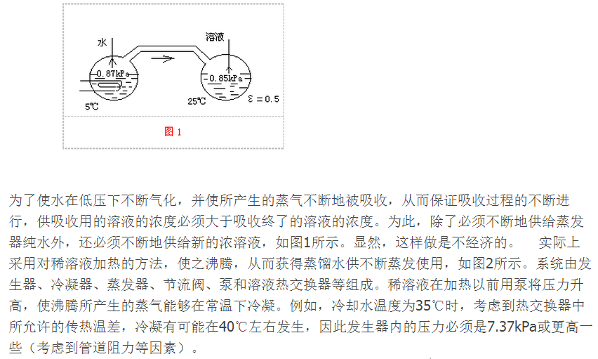 溶液的蒸氣壓力是對平衡狀態(tài)而言的。如果蒸氣壓力為0.85kPa的溴化鋰溶液與具有1kPa壓力(7℃)的水蒸氣接觸,蒸氣和液體不處于平衡狀態(tài),此時溶液具有吸收水蒸氣的能力,直到水蒸氣的壓力降低到稍高于0.85kPa(例如:0.87kPa)為止。