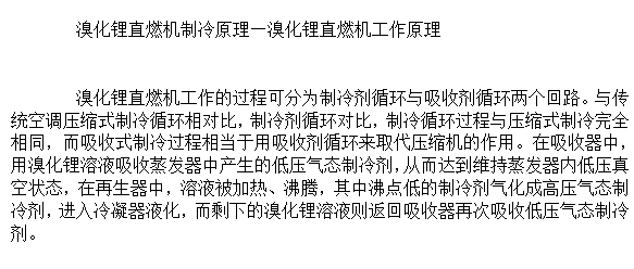 溴化鋰直燃機,是目前世界上常用的吸收式制冷機組。溴化鋰直燃機是利用水為制冷劑,溴化鋰為吸收劑,來制冷、采暖和衛(wèi)生熱水的機組,多用于中央空調(diào)系統(tǒng)。