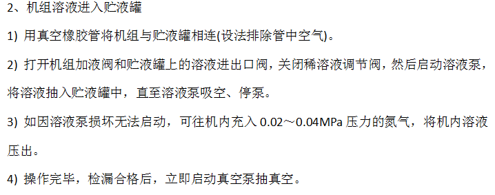 貯液罐的溶液轉移機組檢修時,如溶液需放出機組,應遵循下列原則:一是進入溶液的容器必須保持高度真空;二是在溶液轉移過程中用氣壓產生壓差時,應優先在真空條件下充氮氣,如不得已進入空氣,須在溶液轉移完畢后立即抽真空。
