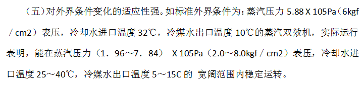 (三)以溴化鋰溶液為工質(zhì),機(jī)器在真空狀態(tài)下運(yùn)轉(zhuǎn),無(wú)臭、無(wú)毒、無(wú)爆炸危險(xiǎn)、安全可靠、 無(wú)公害、有利于滿足環(huán)境保護(hù)的要求。