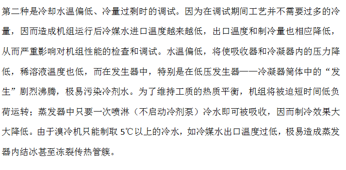 為了保證機(jī)組調(diào)試的順利進(jìn)行,調(diào)試前要使蒸汽壓力穩(wěn)定,冷卻水進(jìn)口溫度穩(wěn)定,冷媒水進(jìn)口溫度穩(wěn)定。蒸汽壓力要在鍋爐負(fù)荷與制冷機(jī)供熱負(fù)荷相匹配的情況下,隨時(shí)調(diào)整蒸汽調(diào)節(jié)閥即可,難點(diǎn)在于冷媒水和冷卻水進(jìn)口溫度的控制。