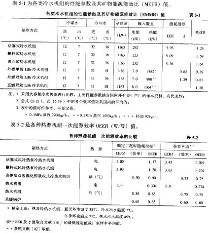 如果蒸汽壓縮式冷水機組和溴化鋰吸收式冷水機組耗用能均直接來自礦物能源,由表5-1中的值可知,應盡量利用礦物能源發電后驅動蒸汽壓縮式冷水機組才具有節能意義,大力推廣直接利用礦物燃料熱能的溴化鋰吸收式冷水機組對提高全國的能源利用率是不利的。同時伴隨著小型鍋爐的大量使用對環境產生污染,這也是一些電力供應充沛的國家極少使用溴化鋰吸收式冷水機組或者近幾年使用這類機組的數量逐漸有所下降的原因。