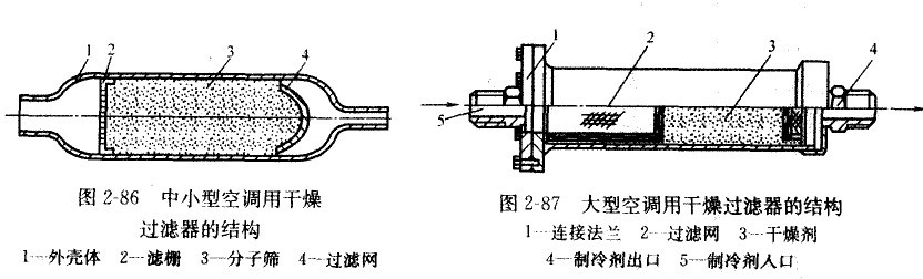 (2)大型空調(diào)用干燥過濾器的結(jié)構(gòu)如圖2-87所示,其以一段銅管或無縫鋼管作為簡(jiǎn)體,簡(jiǎn)體兩端沒有銅絲網(wǎng),兩端有端蓋,用螺紋與殼體連接,再用錫焊或釬焊封固。端蓋外端焊有管接頭,以便與系統(tǒng)管路連接。在過濾網(wǎng)及簡(jiǎn)體中間裝有吸濕干燥劑一一一硅膠或分子篩等。干燥過濾器多安裝在膨脹閥前的液體管路上,當(dāng)液體制冷劑從一端進(jìn)入,從另一端流出時(shí)便得到過濾和干燥。一般在干燥過濾器外用箭頭標(biāo)出液體流向。當(dāng)干燥過濾器使用較長時(shí)間時(shí),應(yīng)將過濾網(wǎng)袋拆下清洗,同時(shí)取出干燥劑進(jìn)行加熱再生或更換。