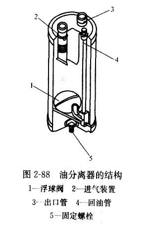 雎縮機(jī)的潤滑是靠從曲軸箱或其他油容器循環(huán)流動(dòng)的潤滑油來實(shí)現(xiàn)的。當(dāng)系統(tǒng)運(yùn)行時(shí),潤滑油與制冷劑混合而成的高壓蒸氣由壓縮機(jī)進(jìn)入排氣管。如果僅有少。星潤滑油隨制冷劑在系統(tǒng)中循環(huán),并不會(huì)影響系統(tǒng)的性能。但是如果制冷劑中混有過多的潤滑油進(jìn)入系統(tǒng),將會(huì)降低蒸發(fā)器和冷凝器的換熱效率,同時(shí)影響系統(tǒng)中流量控制部件的正常工作。通過設(shè)置油分離器,可以減少系統(tǒng)中的油循環(huán)量。油分離器的結(jié)構(gòu)如圖2-88所示,當(dāng)制冷劑氣體被壓縮機(jī)排出時(shí),油隨著氣體進(jìn)入排氣管,通過進(jìn)氣裝置進(jìn)入油分離器,由于速度降低,使油與氣分離,制冷刺氣體通過出口管進(jìn)入冷凝器,而當(dāng)?shù)撞窟_(dá)到一定油位時(shí),浮球閥打開,油通過回油管進(jìn)入壓縮機(jī)。