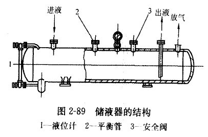 儲(chǔ)液器的結(jié)構(gòu)如圖2-89所示,其一般設(shè)置在冷凝器和節(jié)流元件之間,為使冷凝器中的液體制冷劑順利進(jìn)入儲(chǔ)液器,儲(chǔ)液器位置應(yīng)低于冷凝器300mm以上。對(duì)中小型制冷系統(tǒng),儲(chǔ)液器的容量應(yīng)能收容制冷裝置的全部充液量;對(duì)裝有多臺(tái)蒸發(fā)器的制冷系統(tǒng),儲(chǔ)液器的容量應(yīng)為最大容量蒸發(fā)器與儲(chǔ)液器中正常儲(chǔ)液量之和;為防止溫度發(fā)生變化時(shí)制冷劑的熱膨脹,儲(chǔ)液器中的最大收液量應(yīng)為其容器容積的80%。在能夠滿足使用的前提下,盡量選配容量較小的儲(chǔ)液器,這樣做既可減少裝置的體積和初投資,又可減少制冷劑的充注量。當(dāng)然,并不是所有制冷系統(tǒng)都必須安裝儲(chǔ)液器,如不裝儲(chǔ)液器系統(tǒng)仍可正常工作,則可不裝。