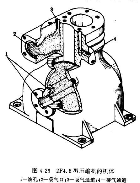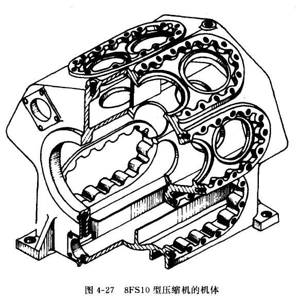 從圖4-27所示的8FSlO壓縮機的機體圖可知,氣缸體上有8個安裝氣缸套的孔座。吸氣腔就是氣缸體的內腔,當吸入蒸氣通過吸氣腔時可冷卻氣缸套,散熱條件好。排氣腔在氣缸體上吸,吸、排氣腔之間有隔板分開。氣缸體下部是曲軸箱,兩側有手孔。機體前后端開有兩個軸承座孔,用以安裝前后蓋。這種機體外形平整,結構緊湊。目前,我國系列產品的機體多用這種結構形式。
