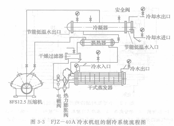FJZ-40A冷水機組流程如圖3-3所示,由圖可見,R22在干式蒸發器內蒸發后,由回氣管進入壓縮機吸氣腔,經壓縮機壓縮后變成高壓高溫蒸氣,然后進入冷凝器中冷凝,冷凝后的制冷劑液體,進入換熱器被從蒸發器來的回氣過冷,再經過干燥過濾器和電磁閥進入熱力膨脹閥,經節流降壓后進人蒸發器,在蒸發器中吸收冷水熱量后,又重新進入壓縮機,如此循環不已。