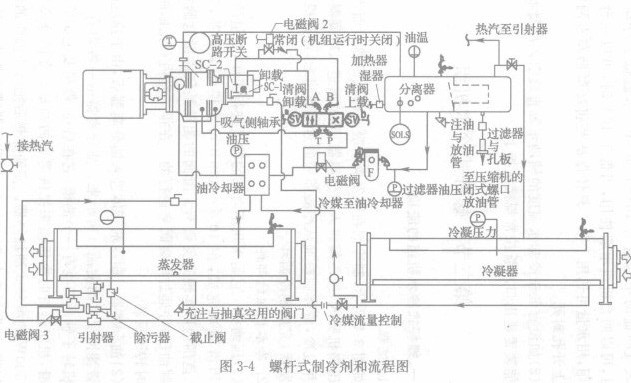 (1)壓縮機它是采用不對稱的轉子進行工作,機組的冷量調節利用滑閥來完成,在10%~100%可實現無級調荷,70%~100%范圍內可實現完美調節一滑閥的驅動是依靠微電腦控制中心控制油壓,并通過電磁閥來進行的。在排氣室內有止回閥,防止停機時轉子反轉。