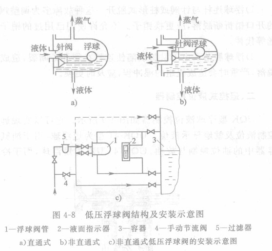 其結果會使容器中的液位保持在要求的水平上,其安裝如圖4-8(c)所示,非直通式浮球閥工作較穩,節流后壓力可高于蒸發器中的壓力,因而可供液到任何地方,它和氣動主閥結合時,可用于大型制冷裝置中。