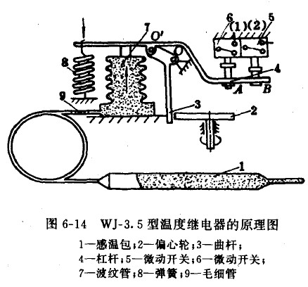 WJ-3.5型溫度繼電器的工作原理,如圖6-14所示。由感溫包l、毛細管9、波紋管7所組成的感溫機構,對杠桿4產生一個頂力,此頂力矩與彈簧產生的拉力矩相平衡,若被測介質的溫度低于調定值時,由于頂力矩小于拉力矩而使杠桿以O為支點逆時針方向轉動,杠桿將微動開關接下,可以切斷電源,停止電磁閥供液,反之,當被測介質溫度上升,則動作過程相反,使微動開關復位,使電磁閥電路導通,電磁閥開通供液。
