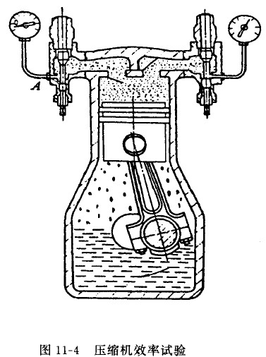 見圖11-4關閉吸氣截止閥,讓壓縮機運轉幾分鐘,將曲軸箱內的制冷劑抽入冷凝器,停車并立即關閉排氣截止閥,在吸、排氣截止閥的旁通孔各裝上高、低壓表。再開車,微松吸氣截止閥旁通孔接管的接扣(見圖中的A處),讓空氣緩緩吸入壓縮機,使壓縮機的排氣腔內壓力慢慢上升。當升至一定壓力,一般為0.98MPa表壓力時,旋緊接扣停止吸入空氣,并讓壓縮機繼續運轉幾分鐘停車。停車10min,看低壓側真空度回升情況。若10min內高、低壓力平衡了,這說明閥板有嚴重滲漏,需予拆修。然后,裝好再作o.98MPa充氣工作,并繼續運轉,根據吸氣下降值來判斷壓縮機的效率。吸氣壓力下降到什么數值的真空度,壓縮機才算好用呢?不同用途的制冷設備有不同的要求,可參考表11-1中的數據。
