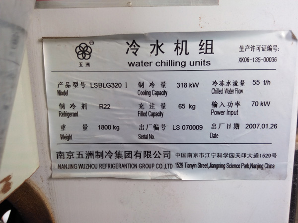 兩臺南京五洲的螺桿式冷水機組出售:型號:LSBLG320 I 生產日期: 2007年 制冷量:318KW