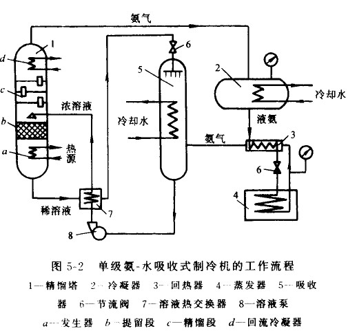 倒5-2為單級氨一水吸收式制冷機工作流程圖,該制冷系統主要由發生器、精餾器、回流冷凝器、回熱器、節流問、蒸發器、吸收器、溶液熱交換器和溶液泵等組成。濃溶液在精餾塔的提餾段中與發生器中產生的含水氨蒸氣接觸,進行熱、質交換,氮