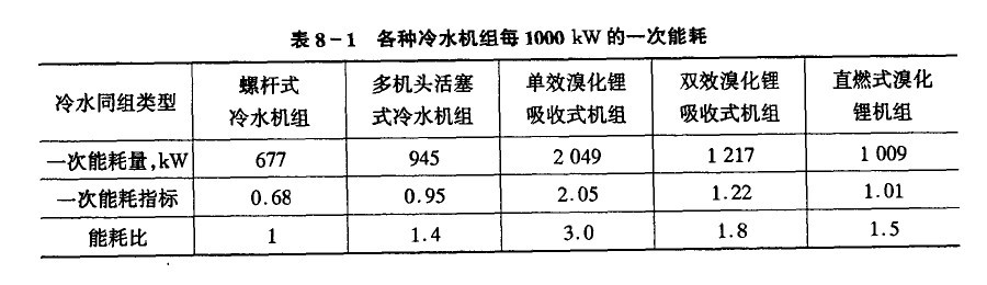 目前各公司的產品性能差異甚大,為此采用同一大型中外合資企業的冷水機組進行比較。冷水機組的運行條件為:冷凍水溫度7/12C;冷卻水進水溫度32℃。分別計算出各種冷水機組的一次能耗量(熱制冷機組包括消耗的電能)、一次能耗指標(即每1kW制冷量所消耗的一次能)及能耗比,計算結果列于表8-1中。不難看到,在上述條件下,吸收式制冷的能耗總體上高于蒸氣壓縮式制冷。但是,如果吸收式制冷機所耗的熱量由熱電站供應,則應考慮到熱電站供熱是利用了發電時本應排到大氣中的熱量,同時還應考慮到由此影響了電能生產的效率,也就是說,應對熱、電、冷聯產系統進行綜合評價。分析結果表明,在一定條件下,熱、電、冷聯產與分產相比是節能的。