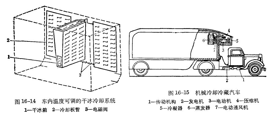 冷藏汽車采用冰冷卻時(shí)可以用水冰,也可以用干冰。用水冰時(shí)是在車廂兩側(cè)的上方裝兩個(gè)可拆卸的三角形箱子,內(nèi)部可裝冰或冰鹽,只要定期將箱子拆下,將其中的水或冰鹽倒出,重新裝入冰或冰鹽即可。冰冷冷藏汽車每次裝入的冰有限,故只能用于短途運(yùn)輸。當(dāng)用千冰時(shí)可以用干冰箱,亦可將干冰直接放在凍結(jié)食品垛上,但這種方法車內(nèi)溫度難以控制。為了克服這個(gè)缺點(diǎn),現(xiàn)在設(shè)計(jì)出一種車內(nèi)溫度可調(diào)的干冰冷卻系統(tǒng),圖16-14即為這種系統(tǒng)的示意圖。裝干冰的金屬板箱1用管道與冷卻板管2相連接,管內(nèi)通以氟利昂在1和2之間循環(huán)吸收熱量,氟利昂的循環(huán)量用電磁閥3自動(dòng)調(diào)節(jié)。干冰冷卻比較經(jīng)濟(jì)適于長(zhǎng)途運(yùn)送凍結(jié)食品。