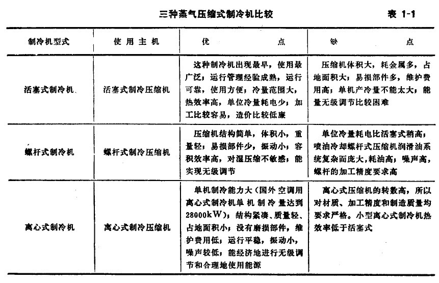 制冷設備--附三種壓縮式制冷機優(yōu)缺點對比圖(表1-1)