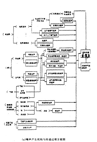 冰箱的器材聲與振動(dòng),主要來源于壓縮機(jī),對(duì)于強(qiáng)制風(fēng)冷卻式冰箱(雙門無霜冰箱、冷凍柜、空調(diào)器……等較大容積制冷設(shè)備)還產(chǎn)生于風(fēng)機(jī)的風(fēng)扇葉輪。在壓縮機(jī)上產(chǎn)生的噪聲和振動(dòng),可以從圖3-50(a)中見到其產(chǎn)生部位和傳遞過程,其中主要是排出管共振聲音、摩擦副滑動(dòng)聲青、電動(dòng)機(jī)磁噪音、防振彈簧脈動(dòng)、殼體內(nèi)氣柱共鳴音、及零部件和殼體共振。