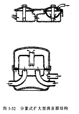 其單缸壓縮機(jī)的排氣脈動(dòng)聲比多缸壓縮饑大,為此要設(shè)計(jì)和制造合理的消音器分別與氣缸鑄成一體;也有單體制造后用銅管加以連接。圖3-51為整體式的擴(kuò)大型消音器。由于脈動(dòng)氣流被多次擴(kuò)大而減壓,使聲音音壓被減低。圖3-52所示為分置式的擴(kuò)型消音器。另一種消音器稱為共鳴型消音器,它在消音器體腔內(nèi)開有若干小孔,使氣流發(fā)生共鳴音頻率來衰減氣流音,圖3-53所示幾種共鳴型消器結(jié)構(gòu),此結(jié)構(gòu)適用較大機(jī)組。消音器的結(jié)構(gòu)用材料要厚一些,并且將回氣管適當(dāng)延長(zhǎng)和將排氣管制成波浪形以減低共振和避開發(fā)生共振點(diǎn)。