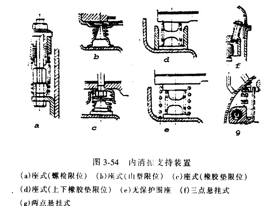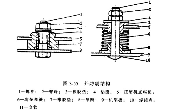 (5)加強(qiáng)壓縮機(jī)封閉殼體內(nèi)外的支持消振裝置。目前采用的有內(nèi)消振和外消振兩類,小型機(jī)組以內(nèi)消振居多。圖3-54為風(fēng)種內(nèi)消振支持裝置形式。圖3-55為外消振裝置。為了防止噪聲和振動(dòng)向箱體傳遞,在采用了內(nèi)消振后,在殼體外部也要加裝防振墊。